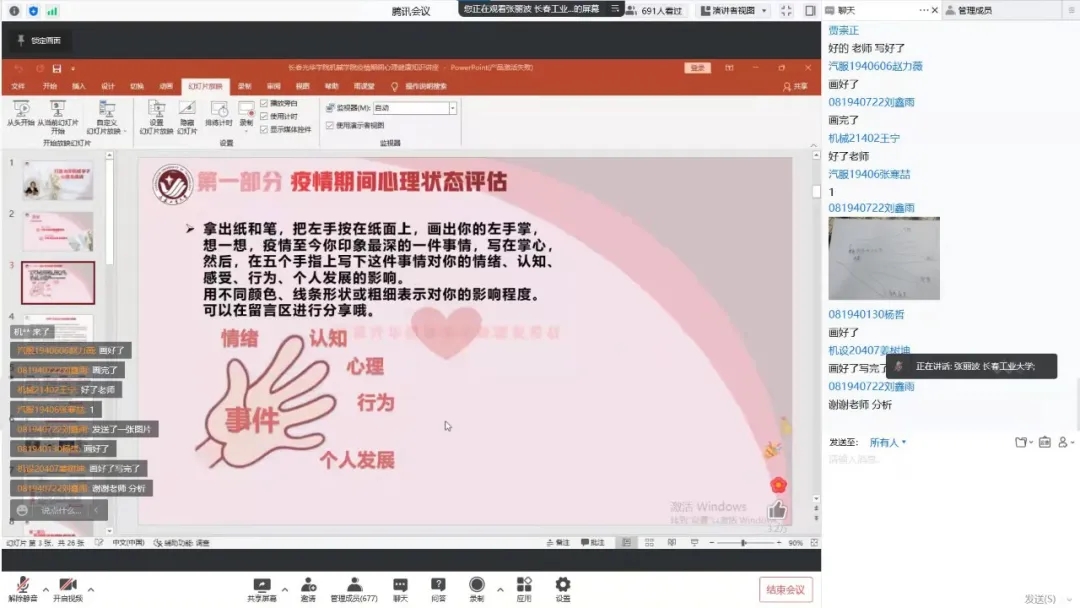 张丽波副教授主要就疫情期间心理状态评估和疫情期间心理免疫处方两个方面进行阐述。会议伊始,张老师以一个活动展开心理状态评估的讲解,并对疫情下员工的身心反应进行科学解读。情绪可以左右人类的一切活动,张老师在此提出,我们要学会调节情绪,从身边微小的事物中获得幸福感,建立良好的社交关系......疫情突至,使人措手不及,良好的心理状态是老员工生活学习的必要条件,维护员工心理健康同时也成为当下的重中之重。在这艰难的时刻,我们师生同心,定会迎接最终的曙光。