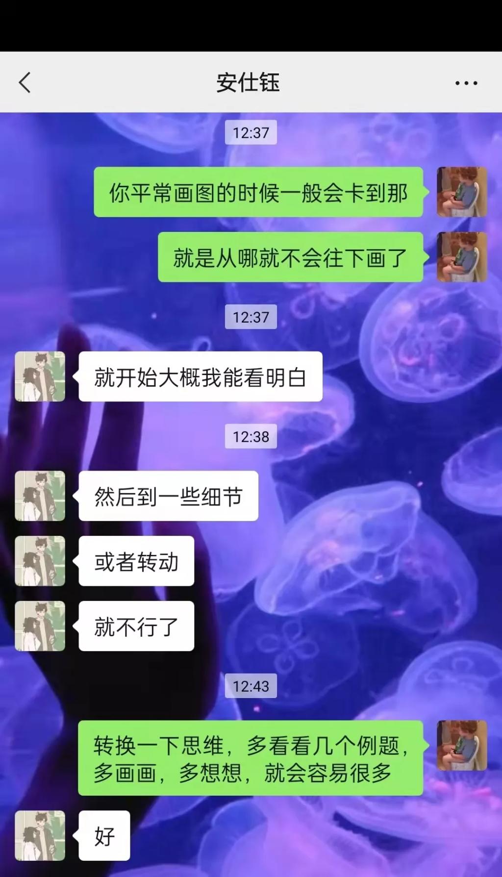 21级的安仕钰同学和郝帅迪同学以微信沟通的方式与向学姐请教,以解决自己在平时学习过程中遇到的问题。帮扶过程中,21级同学认真请教,20级同学仔细思考,严谨的给出自己的解答与看法。一对一帮扶活动不仅有效帮助21级员工获得学识上的成长,同时帮助20级员工重温了知识、巩固了基础,使得彼此共同受益。