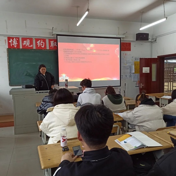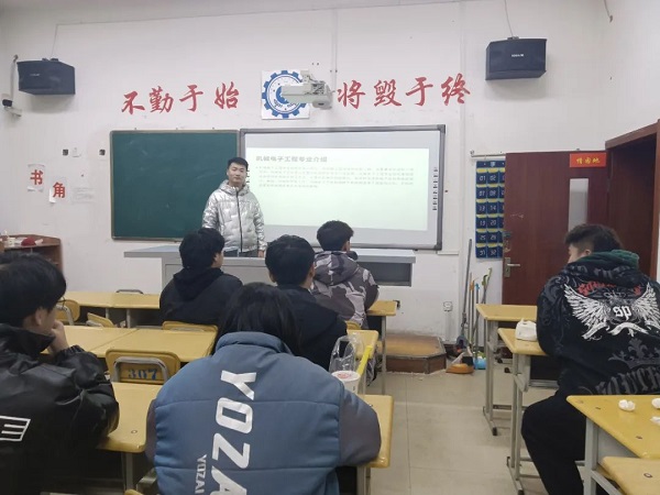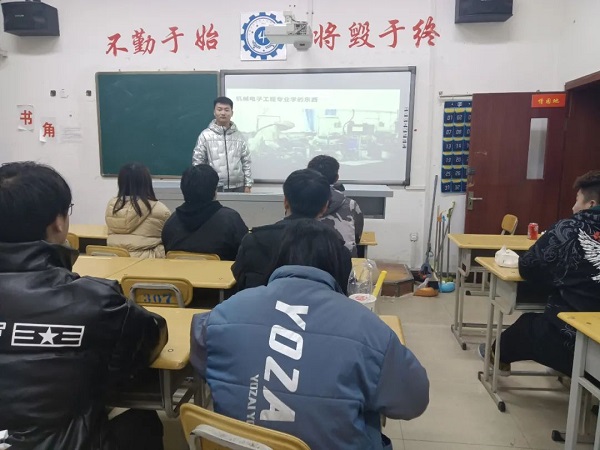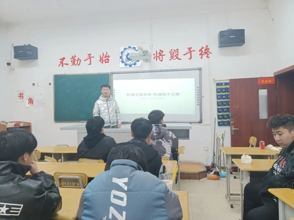 2021年11月10日,机电四班万佳伟同学在二教110开展了以“专业介绍”为主题的课前十分钟,参与成员为机电四班全体同学。