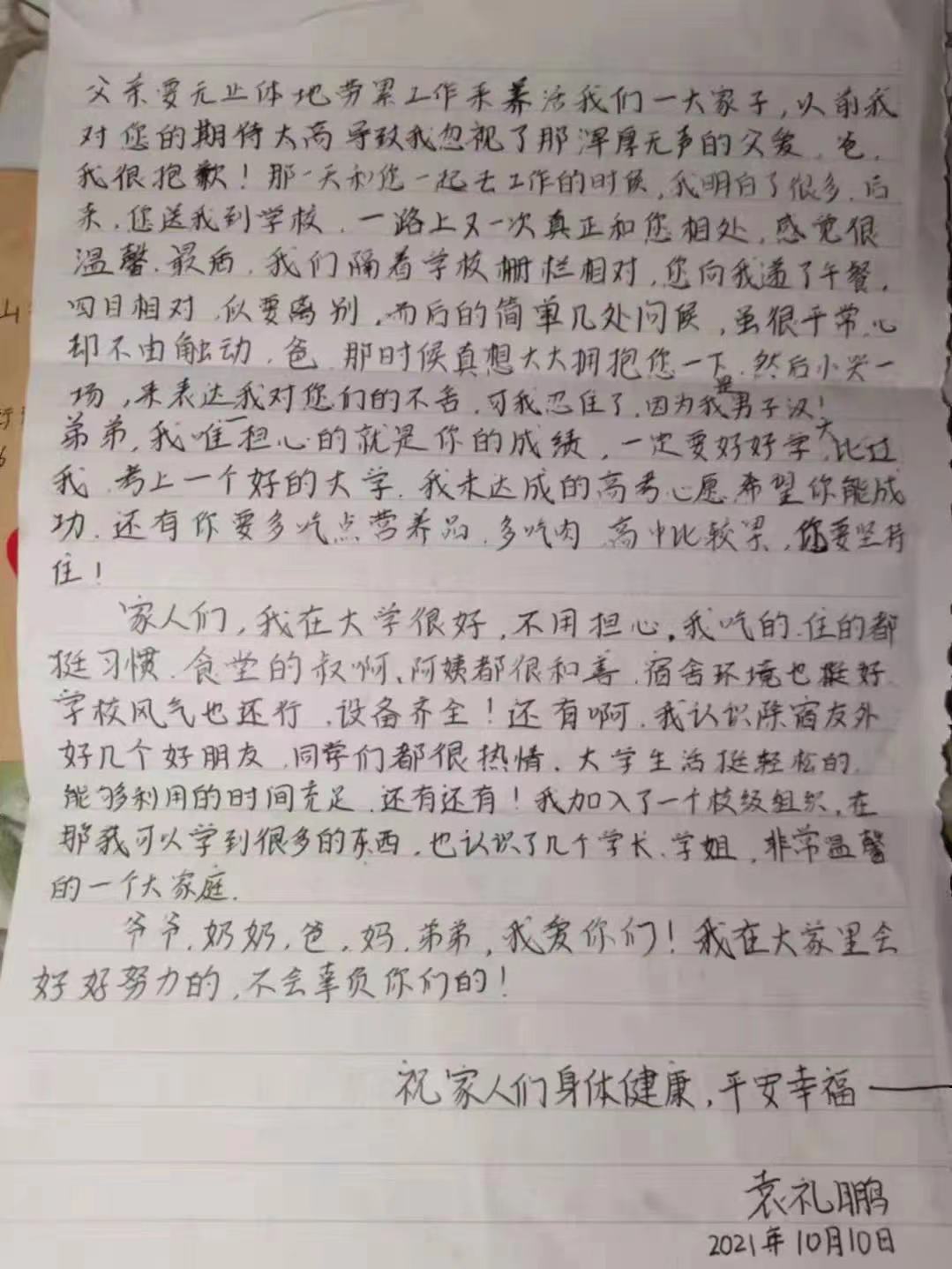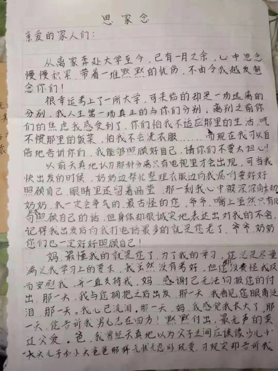 xcsports机械21403班的袁礼鹏同学的家书中,曾经那句难以从口中说出来“对不起”通过家书让父母知道少年已经真正长大,母亲的那句“男儿志在四方”将一直陪伴激励少年不断成长。