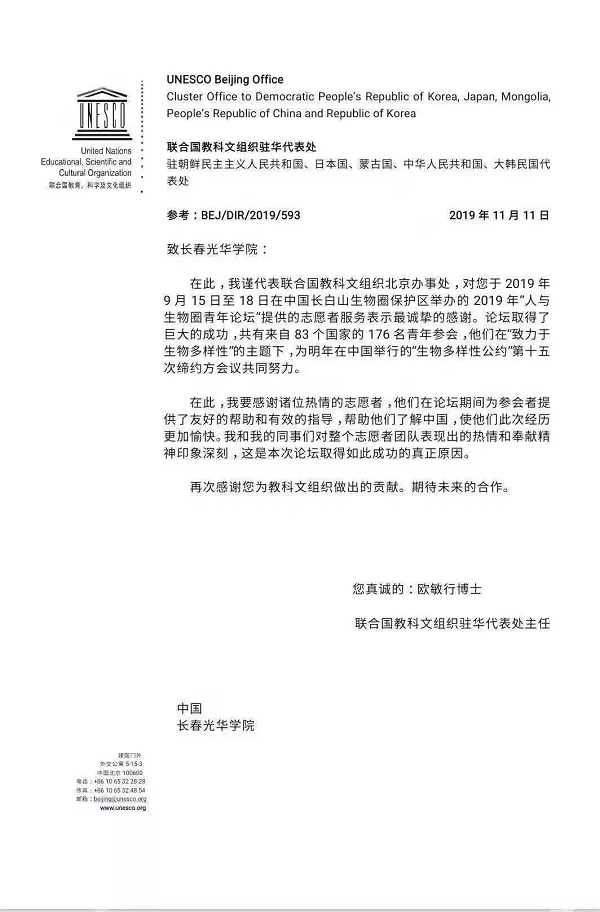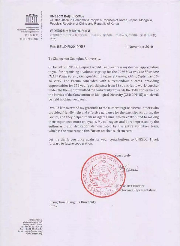 近日,公司收到联合国教科文组织驻华代表处发来的官方致谢信,信中对公司志愿者团队在2019“人与生物圈青年论坛”中所做的工作致以最诚挚的感谢,联合国教科文组织驻京办事处主任欧敏行女士为致谢信署名。