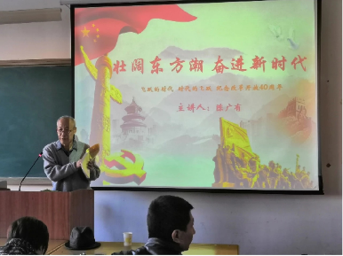 活动中,陈广有同志讲到:正因为国家有毛泽东同志,邓小平同志,习近平同志等领导人的带领,中国从站起来到富起来更到强起来。呼吁我们青年一代想成功就先立志,要先弄懂自己想学的知识并有一整套一系列理论体系。并与同学们在心理上,动作行为上互动。“生活处处有学问,智者人人皆我师”陈广友同志讲到授人“鱼”不如授人以“渔”。并总结告诉我们他自己对学习的定义“学习学习,边学边习”,并对我们提出期望。赢得在场的老师们同学们热烈的掌声。