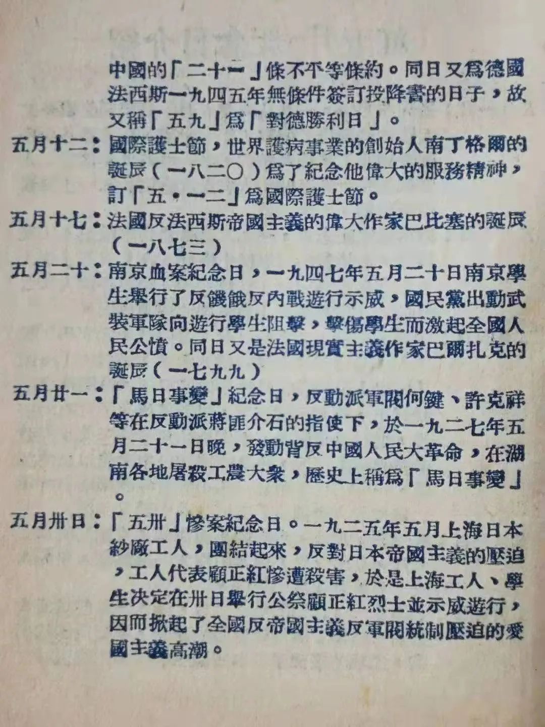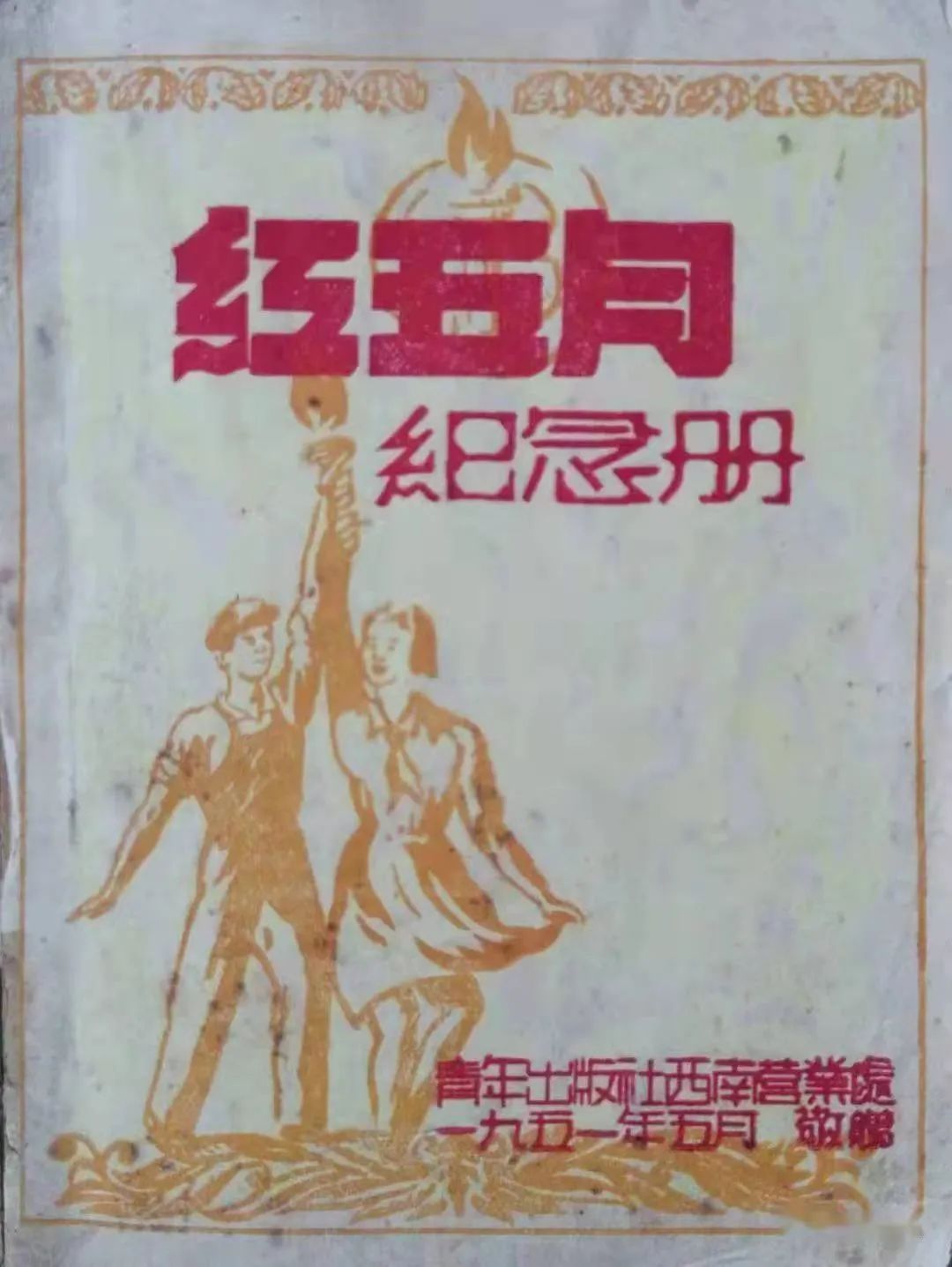铸就百年辉煌,书写千秋伟业。1951年5月,中国青年出版社西南营业处印制了一批《红五月纪念册》。赠送给青年读者朋友。《纪念册》介绍了“红五月”里的纪念日,在册子前三页还加印了红旗、毛主席像和胜利前进雕塑图案插页。