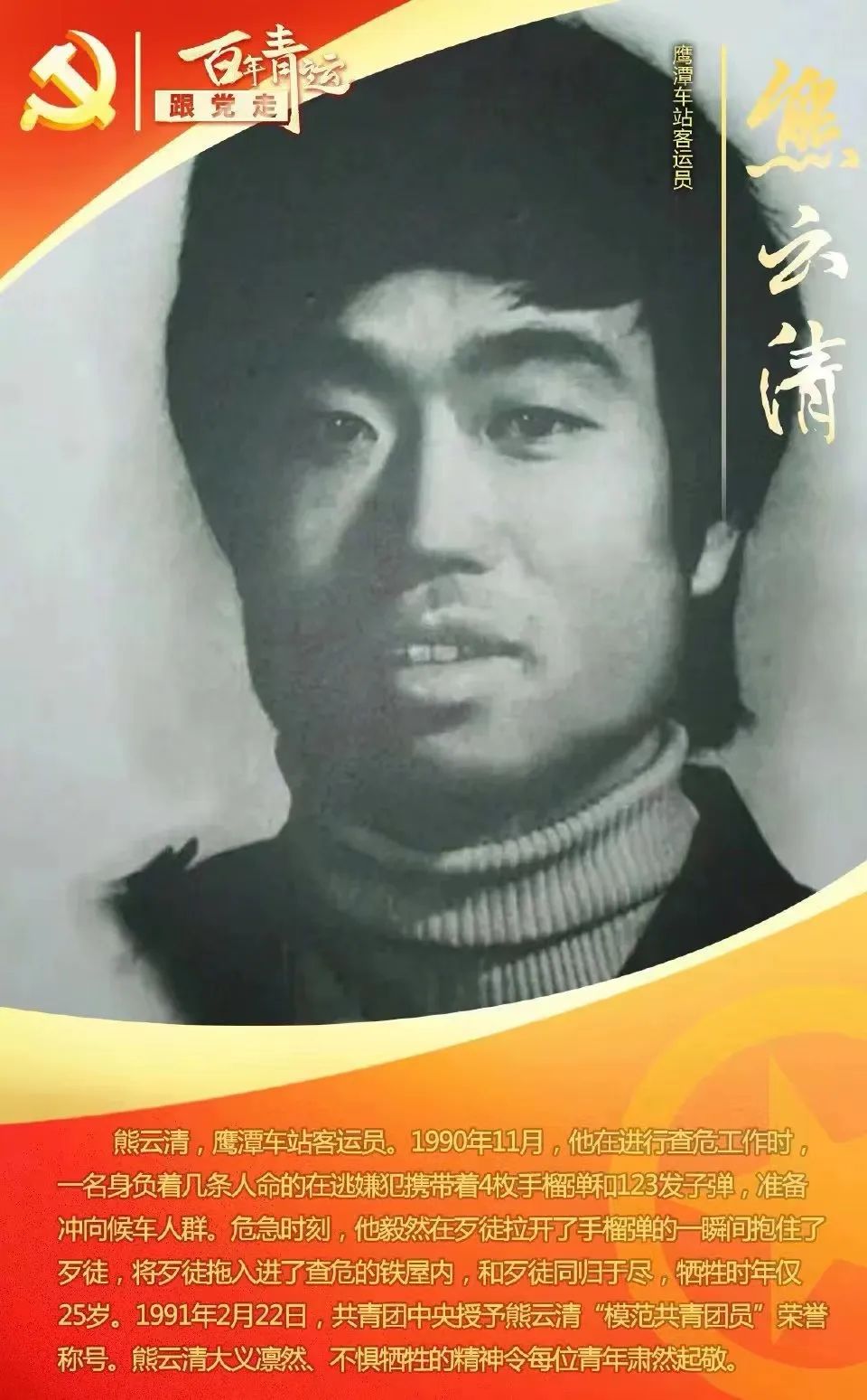 1997年5月,中宣部、国家教委、共青团中央、全国学联联合下发《关于开展大中专员工志愿者暑期文化科技卫生“三下乡”活动的通知》。1990年11月,他在进行查危工作时发现一名身负着几条人命的在逃嫌犯携带着4枚手榴弹和123发子弹,最终和歹徒同归于尽,牺牲时年仅25岁。1991年2月22日,共青团中央授予熊云清“模范共青团员”荣誉称号。熊云清大义凛然、不惧牺牲的精神令每位青年肃然起敬。