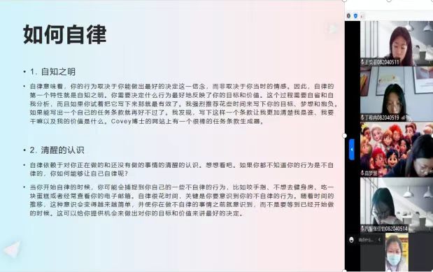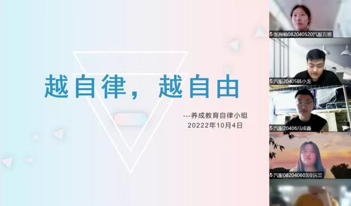 自律就是自我约束,自我管理,自我反省。自律能让我们克服惰性,抵制诱惑,学会战胜自己。如果学习是一条船,那么自律就是造船人;如果理想是遥远的海的彼岸,那么自律就是你的跨海大桥;如果自信是一棵树,那么自律就是泥土里坚硬牢固的根。约束也许会让我们感到不适,但绝对不能放任不管。公司养成教育自律小组的同学们于2022年10月4日在线上开展了“越自律,越自由”主题交流会。