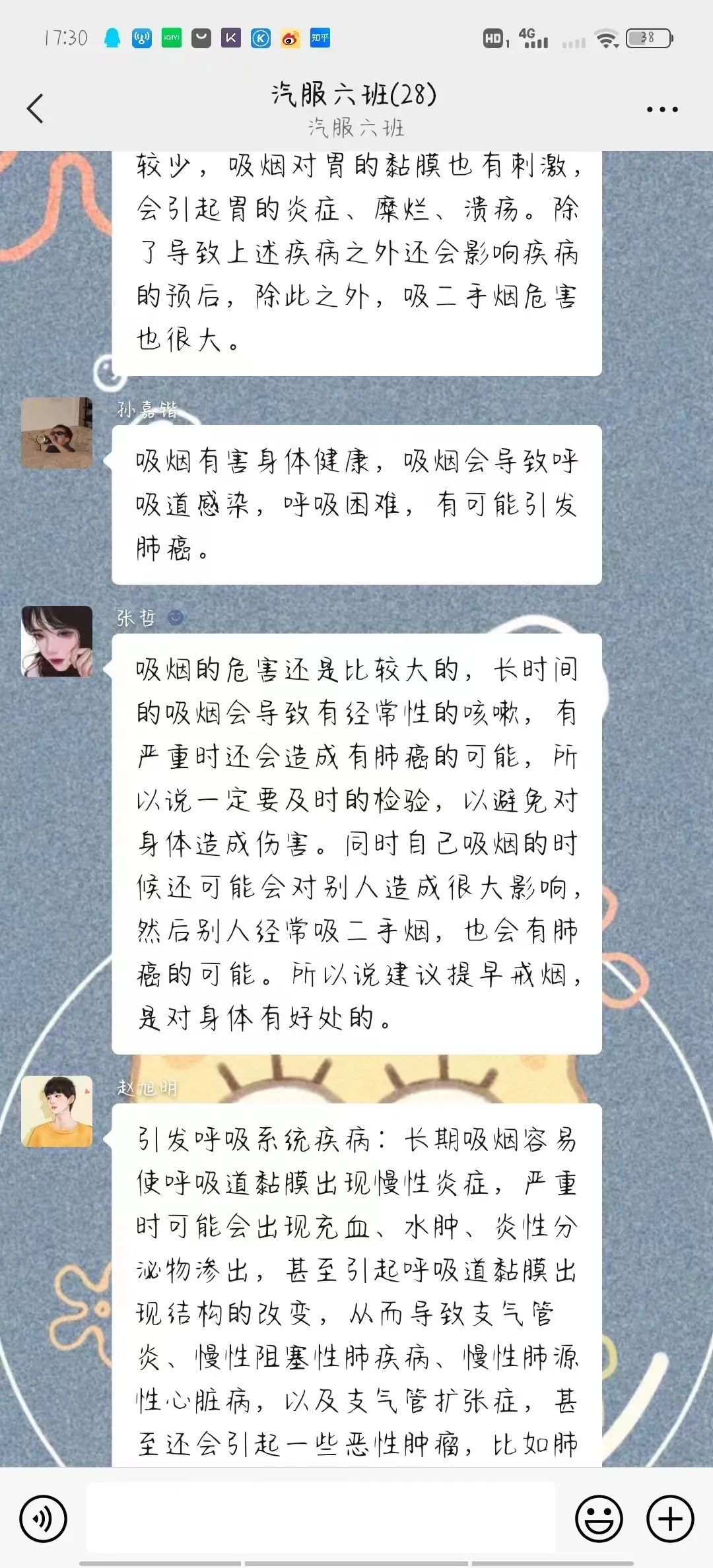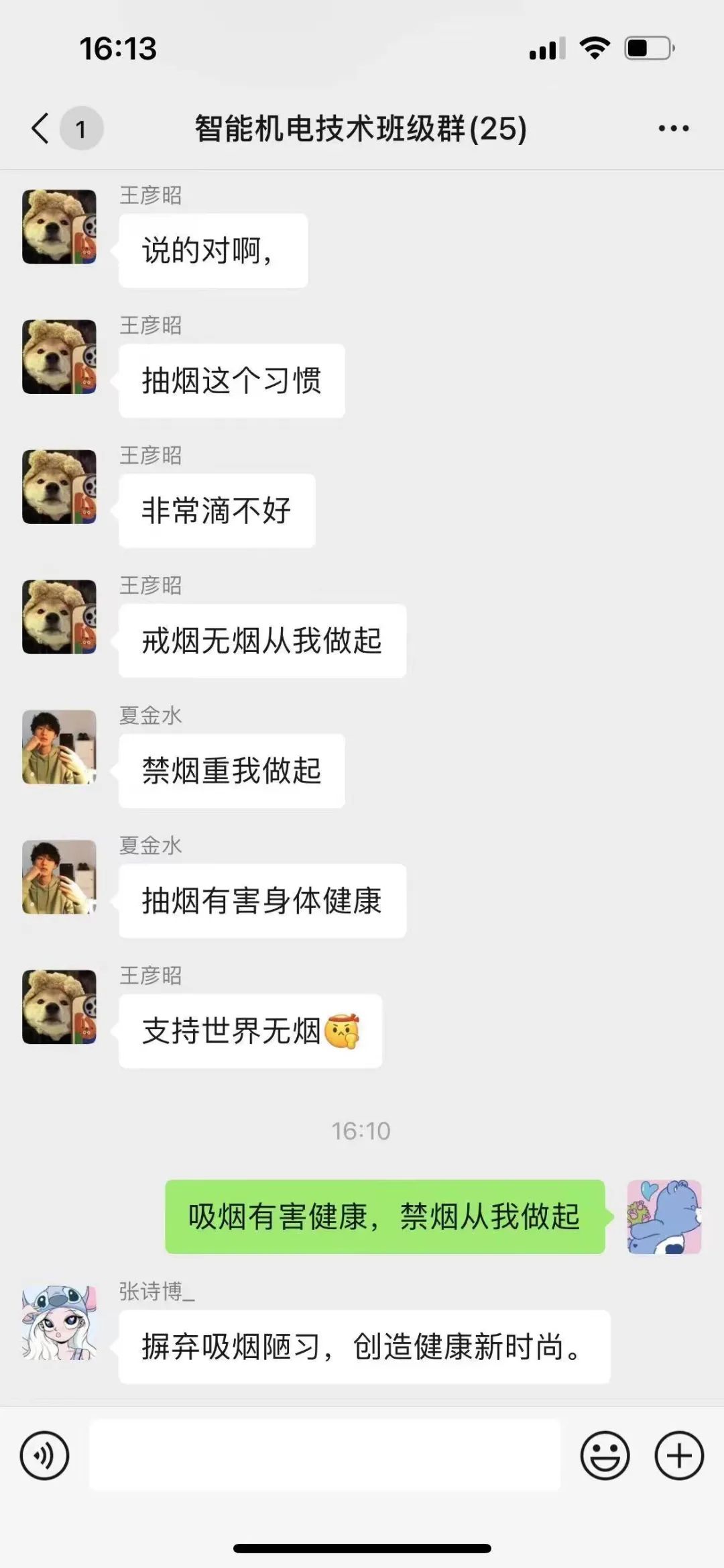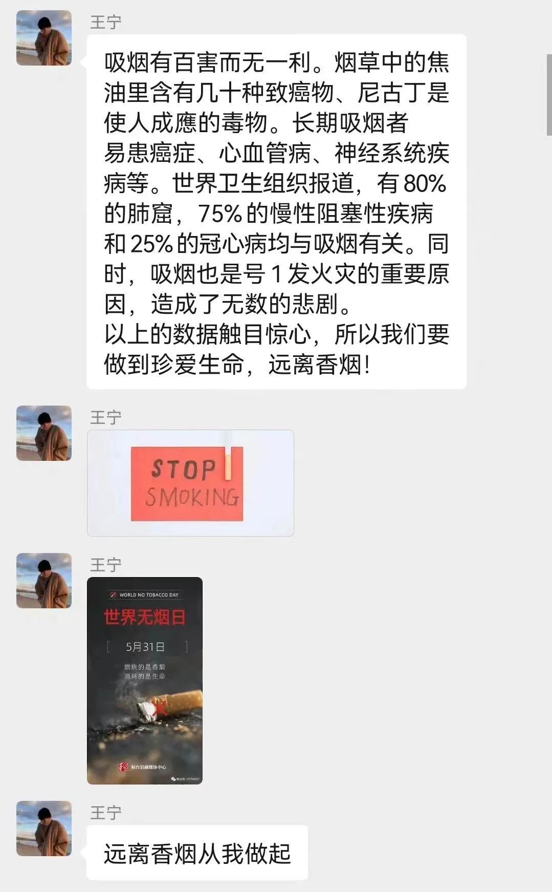在1987年11月,世界卫生组织在日本东京举行的第6届吸烟与健康国际会议上建议把每年的4月7日定为世界无烟日,并从1988年开始执行,但从1989年开始,世界无烟日改为每年的5月31日。养成教育文明小组成员也在各自的班级群里宣传吸烟的危害以及戒烟的好处,同学们积极回应,情绪高亢。小组成员们引领大家在班级群中积极讨论有关吸烟、戒烟等相关话题。并号召大家远离吸烟,健康生活。同学们都响应号召,积极配合。