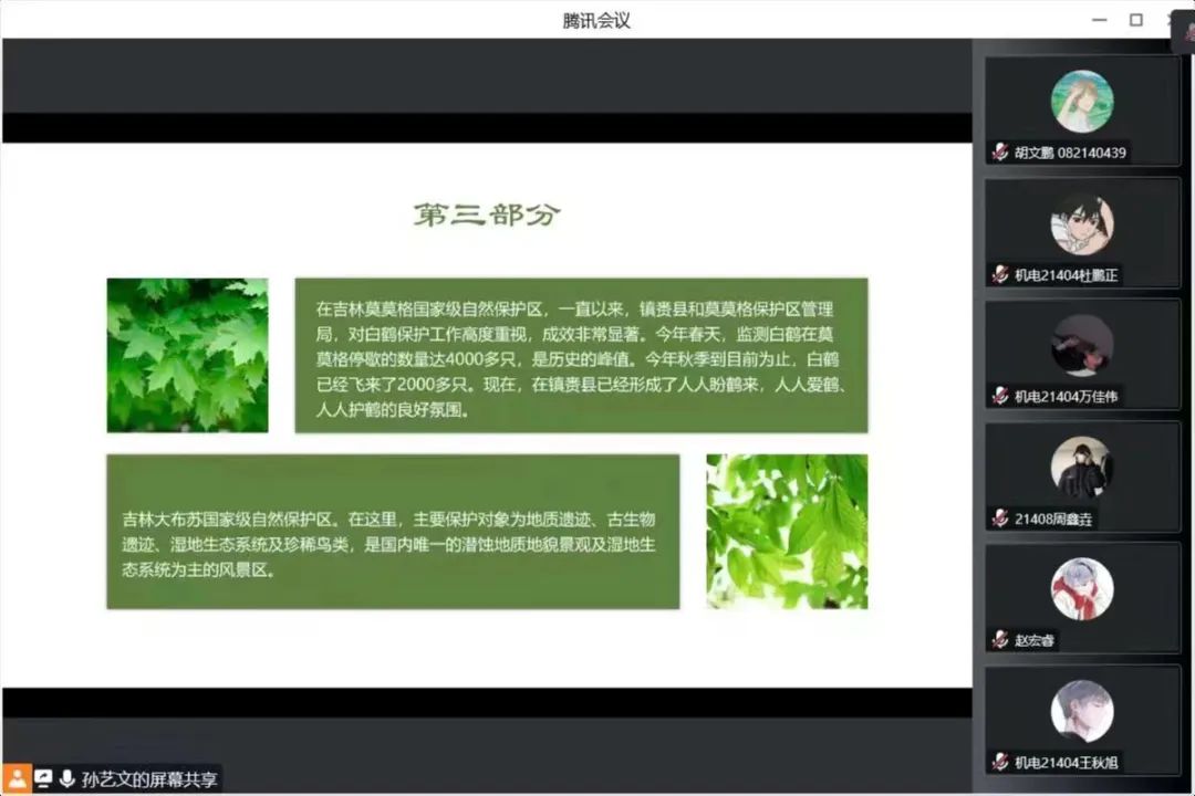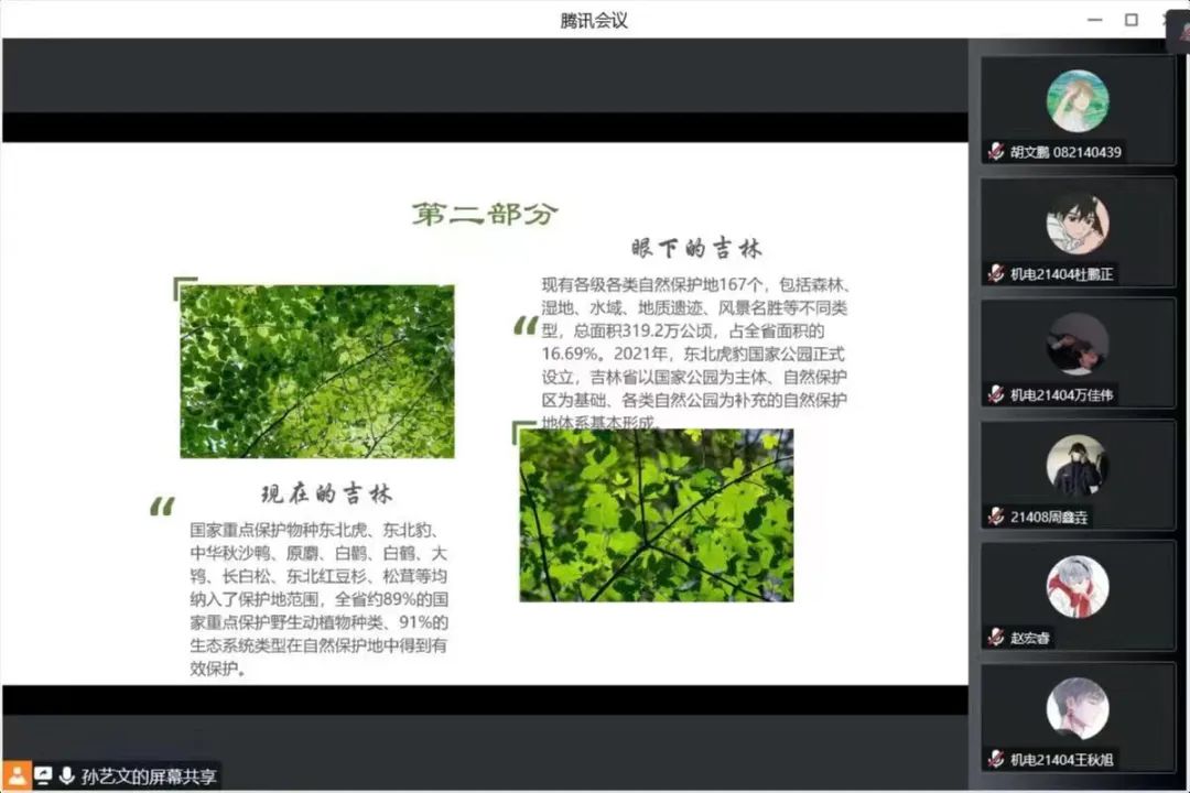 首先,各班团支书向同学们介绍“绿水青山就是金山银山”这一理念,树立起同学们对保护环境的责任感,同时了解吉林省从党的十八大以来对这一理念实施的相关举措。其次,让同学们了解现在的吉林环境变得多么优美,发展起越多越多的保护地供珍惜动物生存,让人与自然和谐相处。最后,就两个国家级保护区进行介绍,让同学们更加了解吉林对自然保护的措施。