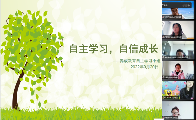 养成教育自主学习小组组长在主题交流会中指出因新冠疫情的原因,同学们在家里上起了网课,在没有老师的监管下,更应该自主学习。自主学习的小组成员们将组长的话记在了心里,他们并没有懒散的学习,而是依然可以做到上课认真听课,有不懂的知识积极主动的问老师;遇到网络卡顿的情况,同学们也会想办法补齐自己没听到的地方;记笔记,写作业更是比在公司还要认真;还有好多同学还借着这次利用网络学习的机会,自行利用网络资源进行学习阅读,学习自己感兴趣的知识,阅读喜欢的书籍。把时间合理利用起来,使线上授课的优势最大化。同学们把“愿学,善学,会学,乐学”作为口号。主动学习的好习惯在同学们之间蔚然成风。张天悦同学表示:“人与人的差距就是在一个人在不断学习另一个人停滞不前中形成的,我选择养成自主学习的好习惯就是为了让自己得到提升,学无止境。”