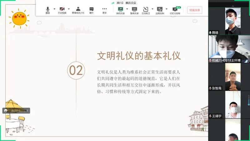 文明礼仪是人类为维系社会正常生活而要求人们共同遵守的最起码的道德规范,它是人们在长期共同生活和相互交往中逐渐形成,并以风俗、习惯和传统等方式固定下来的。xcsports21403班开展了以“创文明校园”为主题的班会。