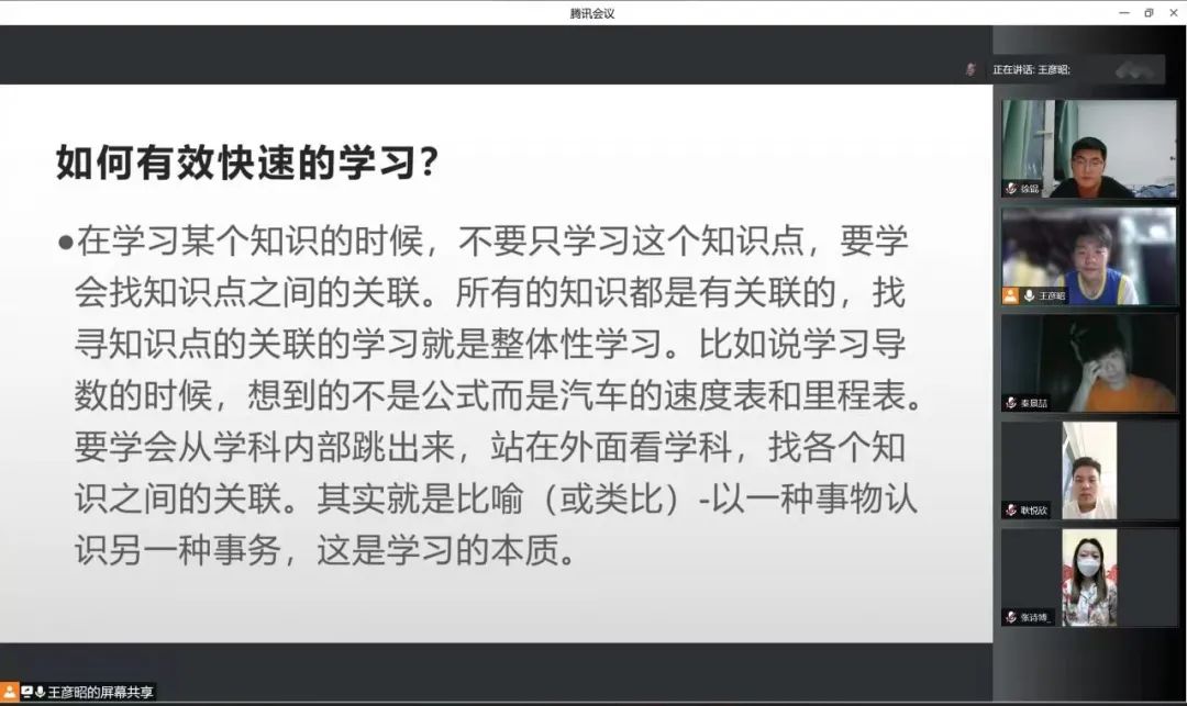 会上,全体同学重点学习了如何有效快速的学习。在学习某个知识的时候,不要只学习这个知识点,要学会找知识点之间的关联。所有的知识都是有关联的,找寻知识的关联的学习就是整体性学习。会上同学们还分享了自己的学习经验。