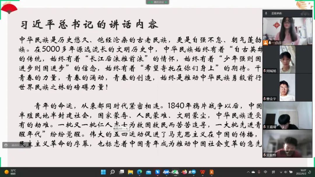 百年风华,青春永驻。为了更好的理解在庆祝中国共产主义青年团成立100周年大会上,习近平总书记发表重要讲话,xcsports于2022年6月15日开展了以“学习贯彻习近平总书记在庆祝共青团成立100周年大会上的重要讲话精神”为主题的线上交流会。