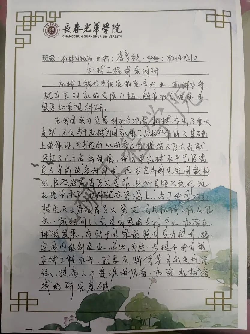 机械21402班的李佳琦同学在调研中了解到机械工程专业就业方向:国家有关部门、科研、高等院校、企业高新技术公司应用CAD及分析软件从事各种机电产品及机电自动控制系统和设备的研究、设计制造,如进行业机器人、微电系统、智解装置等高新技术产品与系统的设计、制造、开发,试验与研究工作从事行业:毕业后主要在机械、仪器仪表、新能源等行业工作。