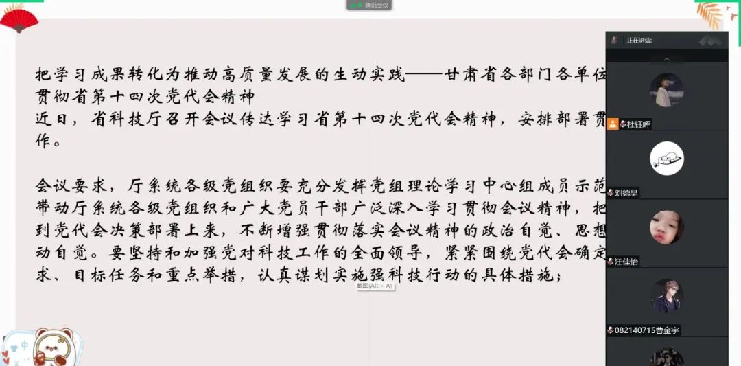 省第十四次党代会胜利召开,绘就了甘肃发展的宏伟蓝图,吹响了接续奋斗的前进号角。会议要求,厅系统各级党组织要充分发挥党组理论学习中心组成员示范引领作用,带动广大党员干部广泛深入学习贯彻会议精神,不断增强贯彻落实会议精神的政治、思想和行动自觉。要大力推进区域科技创新中心创建工作,加大科技型企业培育力度、优化整合省级创新平台、为全面建设社会主义现代化幸福美好新甘肃提供有力的科技支撑。