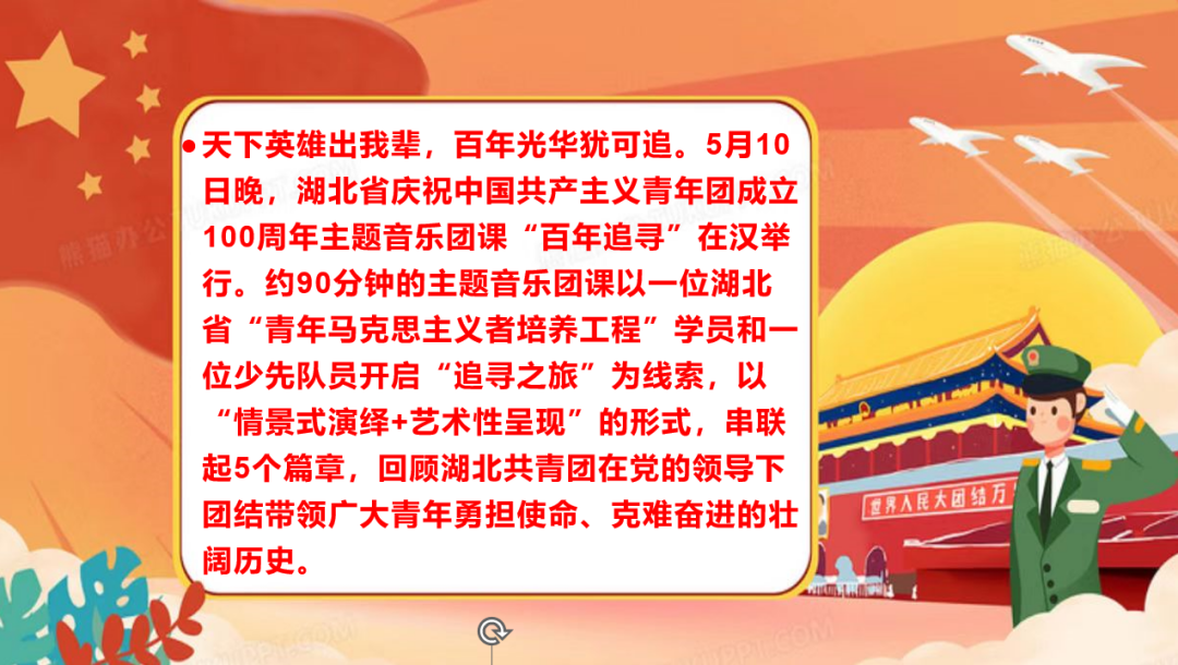 天下英雄出我辈,百年光华犹可追。为了回顾共青团在党的领导下团结带领广大青年勇担使命、克难奋进的壮阔历史。大一全体员工学习课堂于2022年7月10日下午4点在线上开展“百年追寻”主题音乐团课活动。