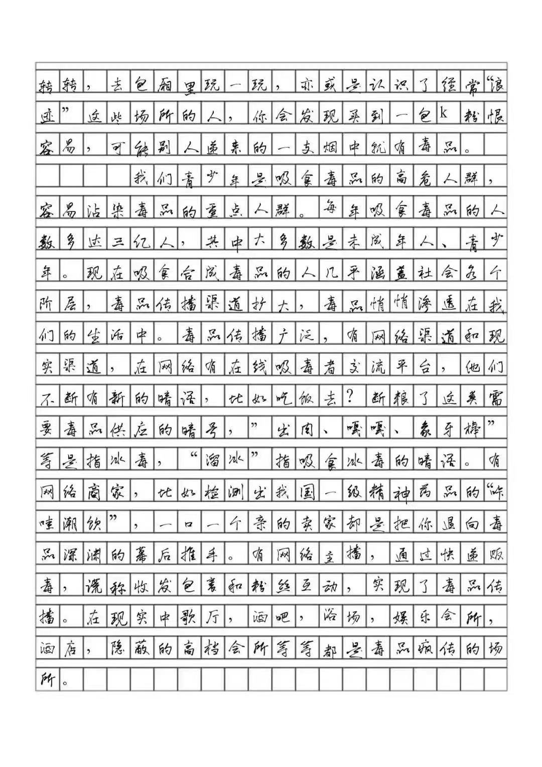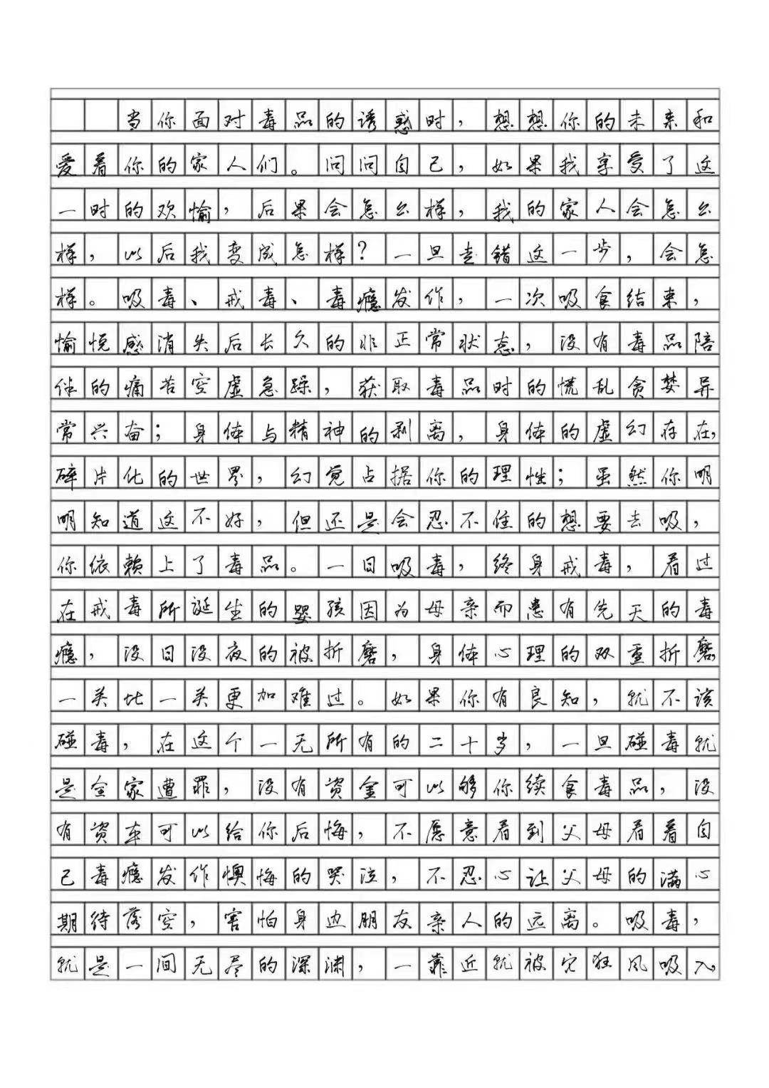 活动期间,同学们积极参与,纷纷展示自己征文作品。从征文中,同学们表达了对毒品的拒绝,内化于心,外化于行,也有助于员工树立健康积极的人生观和价值观。炎黄子孙矢志不渝的禁毒斗争给人类留下了经验和教训、贡献和辉煌。通过本次活动,带动了更多的同学参与禁毒工作中,有良好的教育意义。