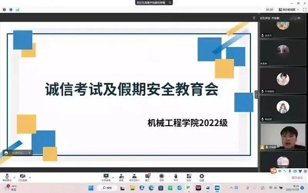 首先,辅导员老师对即将到来的期末考试进行各方面部署:时间安排、考场编排、缓考办理以及签署《线上考试诚信承诺书》等事宜。其中,着重提出了考试纪律的问题,表明了诚信考试的重要性,并预祝同学们考试顺利。随后,会议强调了假期安全的问题。提醒大家要注意防范电信诈骗;不要聚集,必要出门时也应尽量去人少的地方,做好自身防护;假期在家要再度提升用电安全的意识,降低意外发生的可能......增强防范意识,绽放生命光芒!