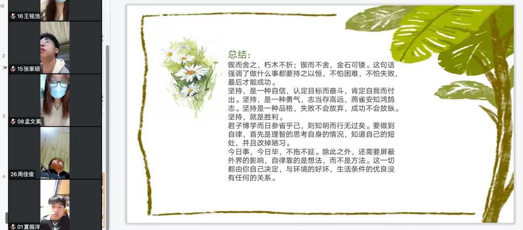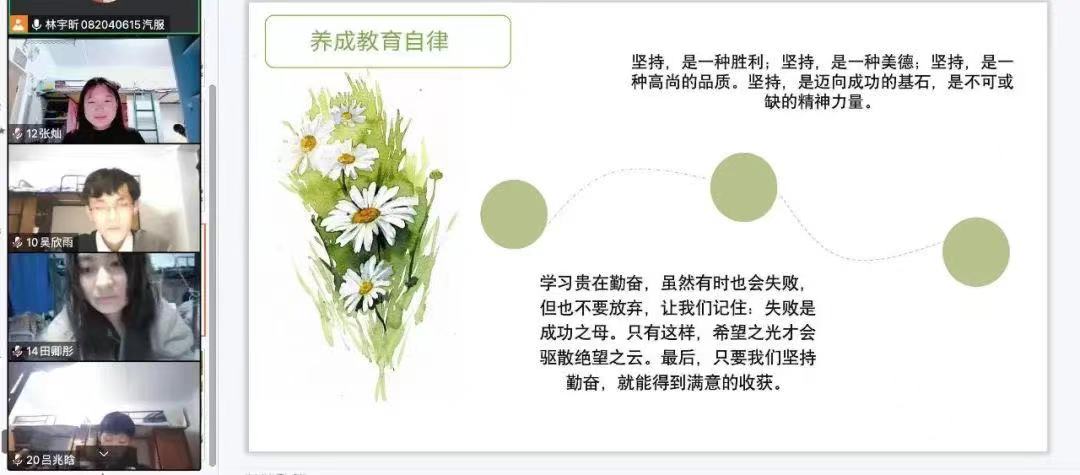 活动伊始,负责人表述了此次活动的主要内容以及活动的意义并鼓励同学们在疫情期间更应该要自律认真起来,将好习惯和日常学习生活相结合,我们通过APP进行英语打卡活动,这样不仅充实了自己的日常生活,还能够为自己将来的英语考级做准备,培养同学们认真做事情的好习惯。小组成员积极参与,踊跃分享,热烈的讨论在单词背诵上的技巧。负责人总结到:“认真代表着自己有着强大的信念,新一代老员工更要如此,在疫情的非常时期内更应该认真对待每一件事,希望全体成员们能够每天认真打卡记录,充实自己。”