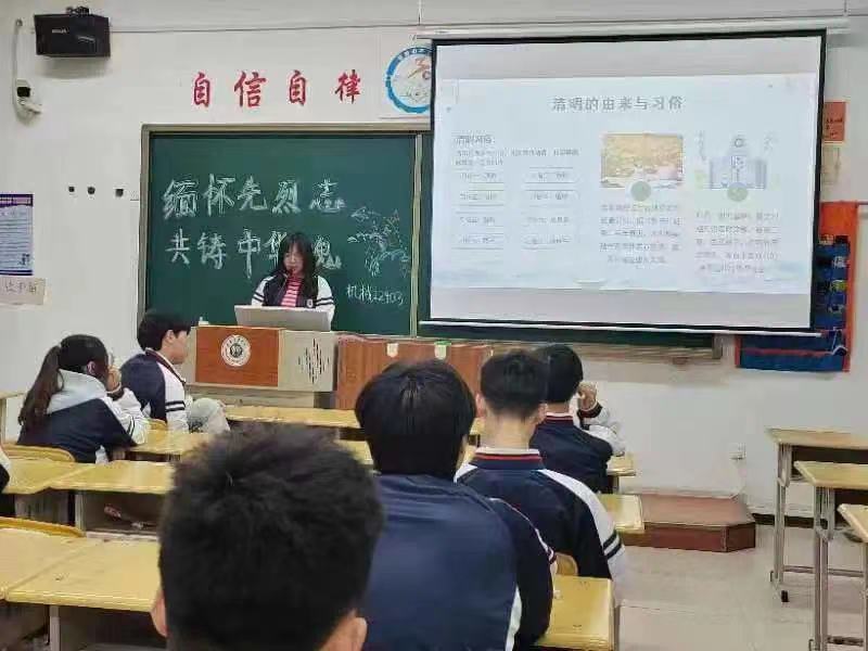 首先,团支书以清明节起源入手带大家充分了解清明节,使同学们从中学习并深刻体会中华传统节日的意义。然后介绍了清明节的发展历史以及一些风俗习惯,鼓励大家做先进文化的传播者、时代精神的弘扬者、人民利益的维护者。随后,团支书准备的清明节的故事传说以及风趣幽默的视频使大家在欢乐放松的氛围里了解清明节的风俗习惯和各种活动,最后紧扣主题向大家展示了革命先贤的英雄事迹,引导同学们铭记革命先烈光荣事迹,倍加珍惜今天幸福生活,学习民族精神和时代精神,树立热爱祖国、热爱人民、热爱中华民族的人生信念。