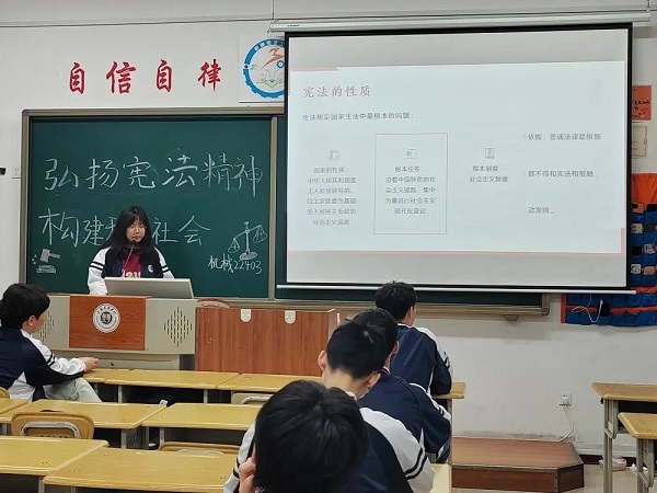 活动伊始,团支书以宪法的基本内涵入手带领大家深入了解宪法。一改大家之前对宪法刻板严肃的印象,对宪法更多了一分信任和依赖。之后团支书又以生动有趣的普法视频让大家更理解宪法的作用和不可侵犯。活动接近尾声,团支书重申了宪法的作用,大家也更明白了在现代社会中,文明秩序的构建需要法治精神的推动,和谐社会要建立在法治社会的基础上。而社会文主义法治国家的建立,在很大程度上依赖于公民和全社会法律意识的提高。要构建和谐社会,就必须尊重宪法和法律的权威,增强全社会的法制观念,尤其要注重发挥宪法作为根本法的核心作用。