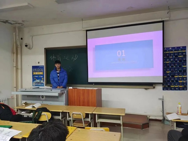 活动伊始,这次会议由石少甲同学主持。他通过PPT向大家讲述如何找到适合自己的运动的好处与锻炼对我们的好处。第一步就是了解自己的身体情况,认识自己,随后根据自身条件制定一份科学的锻炼计划。这份计划要科学合理,适合自己。例如:早起跑步,锻炼时间超过30分钟才起效,亦不可时间太久,注意劳逸结合,饭后不要坐着或是躺着,做些适当活动,掌握好度就行了。随后,石少甲同学向大家介绍了慢跑,跳绳等诸多运动,同时告知大家热身的重要性。在进行运动前,适当做些准备运动,从而让身体逐步进入运动状态,这样才能把体育锻炼的好处最大化。在运动了一段时间后,需要让疲惫的身体休息一下。最后石少甲同学叮嘱大家:“在进行运动训练时,注意力一定要集中,不能因为旁边的事情干扰到你,更加不能够在训练时心不在焉,这样的话比较容易弄伤身体。”