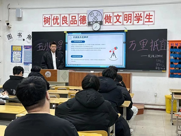 在本次学习课堂中,团支书通过讲解PPT,让大家深入了解了航空航天的有关知识,使晦涩难懂的专业知识贴近大家生活。在此之后,团支书带领大家观看了相关视频,对刚刚学习的知识进行了巩固,同时深入贯彻落实了航空航天精神融入老员工思想政治教育的策略。同学们也结合PPT,黑板报,以及相关视频详细了解到了中国航天的发展历程,知道了“航空”精神植根于空间发展的意义,更理解了我国的航空航天事业不仅仅在于回顾过去,更在于展望未来面临的机遇和挑战,充分体现了中国不断向航天强国和科技强国迈进的决心和毅力。