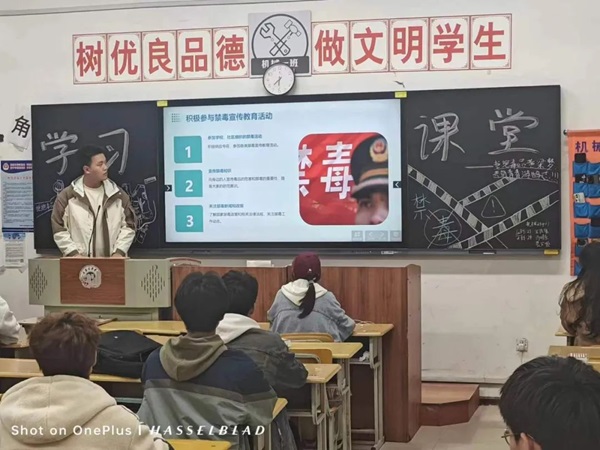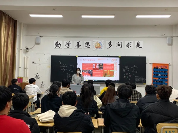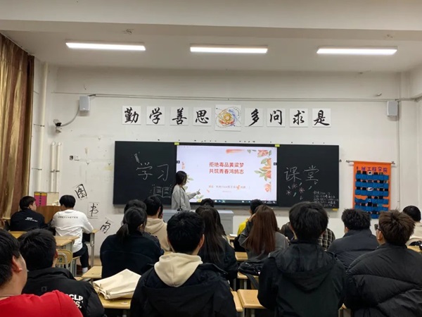 活动伊始,团支书通过PPT向同学们讲解了什么是毒品,以及毒品的种类、危害和预防并普及了《中华人民共和国刑法》、《中华人民共和国禁毒法》等国家相关法律法规知识。然后,团支书通过播放相关视频以及结合典型案例,让同学们更加深刻直观地了解到毒品对自身、家庭和社会的严重危害。大家也深入体会到禁毒教育的重要性。同时,团支书还告诉同学们要养成积极向上、文明健康的生活态度,擦亮双眼、小心防范,自觉远离和抵制毒品。最后,团支书告诫大家,不要对毒品产生好奇心,不要贪图小便宜,不要轻信谎言,要学会保护自己,提高抵御毒品侵袭的能力,懂得辨别生活中引诱青少年吸毒的手法,树立坚固的思想防线。