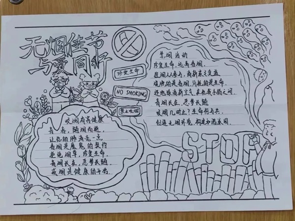 开展“无烟校园,清新永远”主题手抄报活动,以直观明了的方式更进一步的倡导了师生健康文明的生活方式,构建卫生和谐的校园环境,让更多同学重视吸烟的危害以及禁烟控烟的重要性,把健康知识转变为健康行为,养成健康生活习惯,共建清洁环保的无烟校园,共享绿色健康的生活环境。