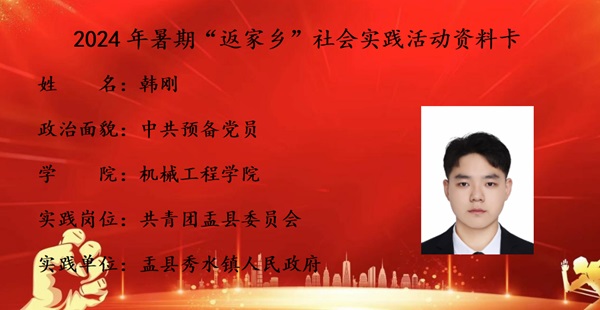 韩刚同学在秀水镇人民政府进行社会实践工作。实践期间,他参与多个部门的工作,包括整理文档资料、协助组织活动、深入基层调研和与群众沟通交流。他在各项工作中表现出色,细心专注、积极热情、认真负责、真诚耐心,深刻感受到政府工作的复杂重要,体会到团队合作力量,被同事的敬业与专业感染,让他懂得工作要严谨认真,要不断提升自我。深入基层的经历,让他看到乡村发展现状,感受到群众对美好生活的向往,他们的真诚质朴触动着他,更让他明确身为青年的责任与担当。