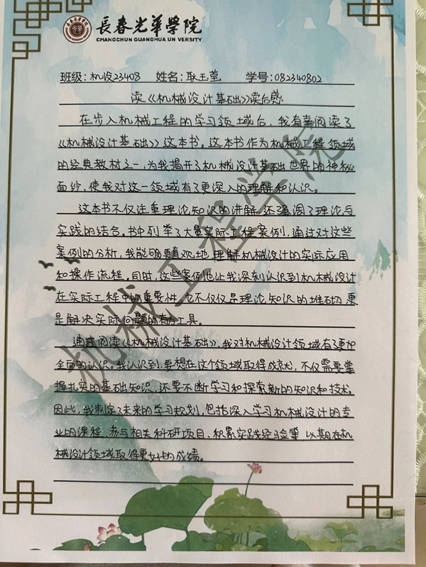 机设23408班的耿玉莹同学通过阅读《机械设计基础》,直观地理解到机械设计的实际应用和操作流程,同时借助书中列举的大量实际工程案例,深刻认识到了机械设计在实际工程中的重要性。它不仅是理论知识的堆砌,更是解决实际问题的有力工具。书中提到的许多新技术、新工艺和新材料,都展示了机械设计领域日新月异的发展态势。