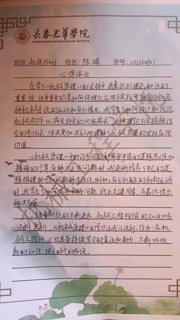 机设23408班陈瑶同学在读完《机械原理》后意识到了理论知识的重要性,同时更加深入地理解了机械设计的基本原理和机构的运动特性,也对机械设计与制造领域的发展有了更加全面的认识。机械的设计不仅要考虑机械的构造,更要考虑其性能、效率和可靠性。只有这样,才能设计出适用于不同工作环境的高效、稳定、可靠的机械。