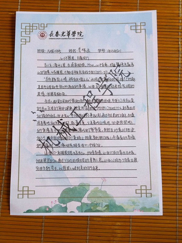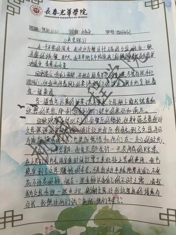 汽服23405班的李梦涵同学认为,感恩不仅仅是一种心态,更是一种行动。看到父母工作的忙碌,她决定利用暑假时间为父母做一些力所能及的事情,用实际行动来报答父母的恩情。感恩父母不需要华丽的礼物,也不需要过于奢侈的物品,生活中尽一点绵薄之力就足以表达内心的语言。作为员工,我们应该珍惜家庭,珍惜亲情,不忘初心,牢记父母的辛勤付出,让他们为我们感到骄傲。
