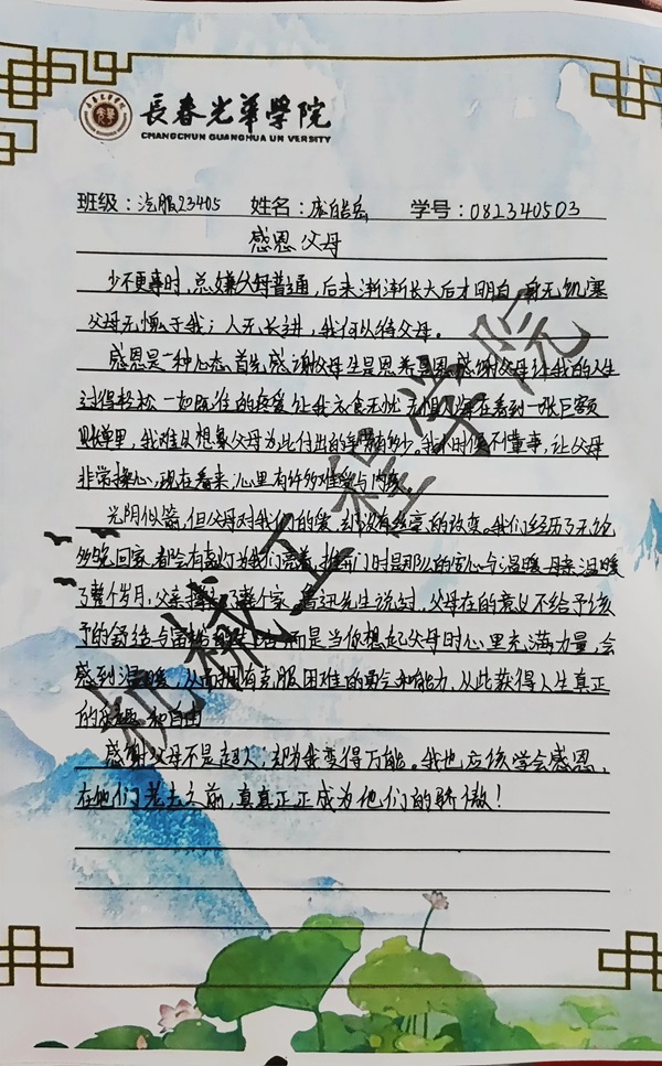 “施惠勿念,受恩莫忘。”通过此次活动,同学们更加深刻地理解了父母的不易,增强了家庭责任感和亲情观念。同学们表示,一定会将感恩之心内化于心,外化于行,以更加积极的态度紧跟时代脚步,心怀感恩,砥砺前行,不负时代所托,争做新时代德才兼备的向上青年。