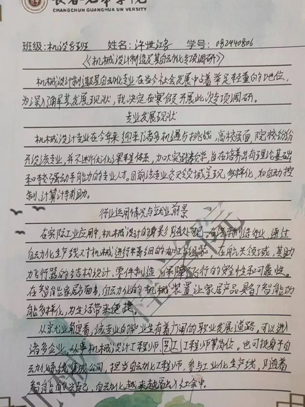 机设24408班的许世鸿同学对机械设计制造及其自动化专业进行了调研,了解到此专业是具有远大发展前景的未来产业,其融合了多学科知识。它以机械工程为基础,深入学习力学、机械原理、机械设计等理论知识,用于机械产品的设计开发,同时涵盖机械制造技术,包括金属切削原理与刀具、机床夹具设计、机械制造工艺学等内容,以实现产品的高效、精密制造。机械设计在汽车、航天、智能家居等工业领域应用广泛,保障产品从加工组装到功能实现。该专业就业面广,毕业后可在多家企业从事多种工程师岗位,随着智能化发展其前景也变得更加广阔。