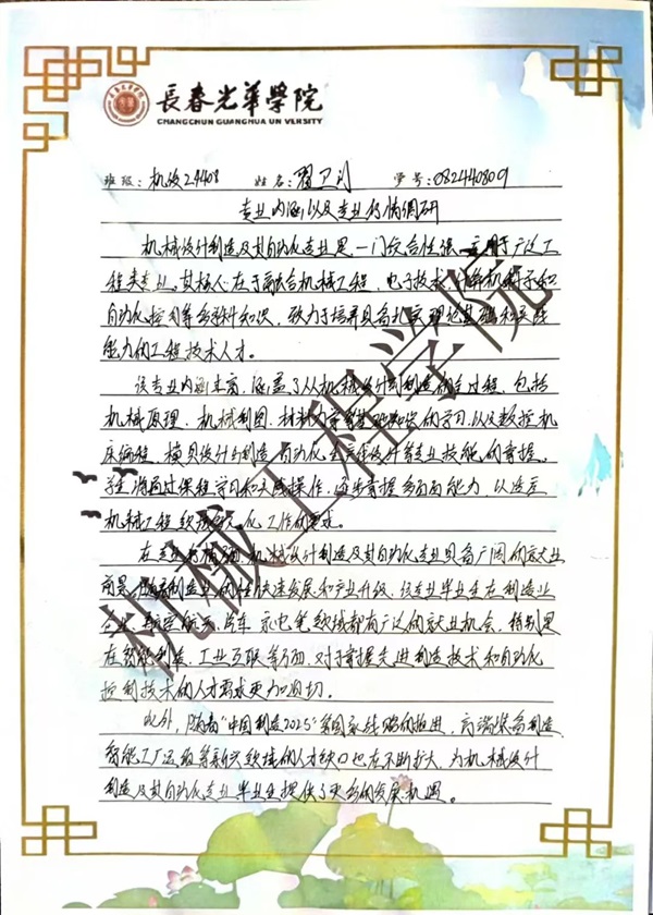机设24408班的翟卫洲同学通过调研发现,机械设计制造及其自动化是一门融合性与应用性强的工程类专业,其核心是融合了多学科知识,为培养具备扎实理论基础与实践能力的工程技术人才做准备。未来,随着机械设计制造及其自动化领域的不断发展,与之相关的服务市场将呈现更加多元化、专业化的趋势。机械设计制造及其自动化服务市场有着广阔的发展前景和巨大的市场潜力,相关企业应该抓住机遇,提高服务品质,创新服务模式,以满足客户的需求。