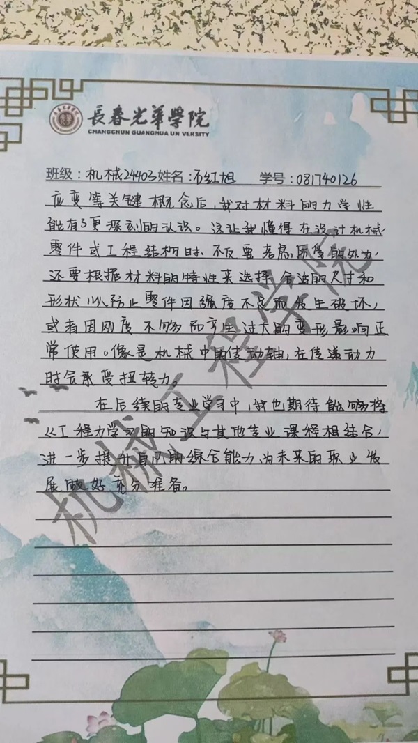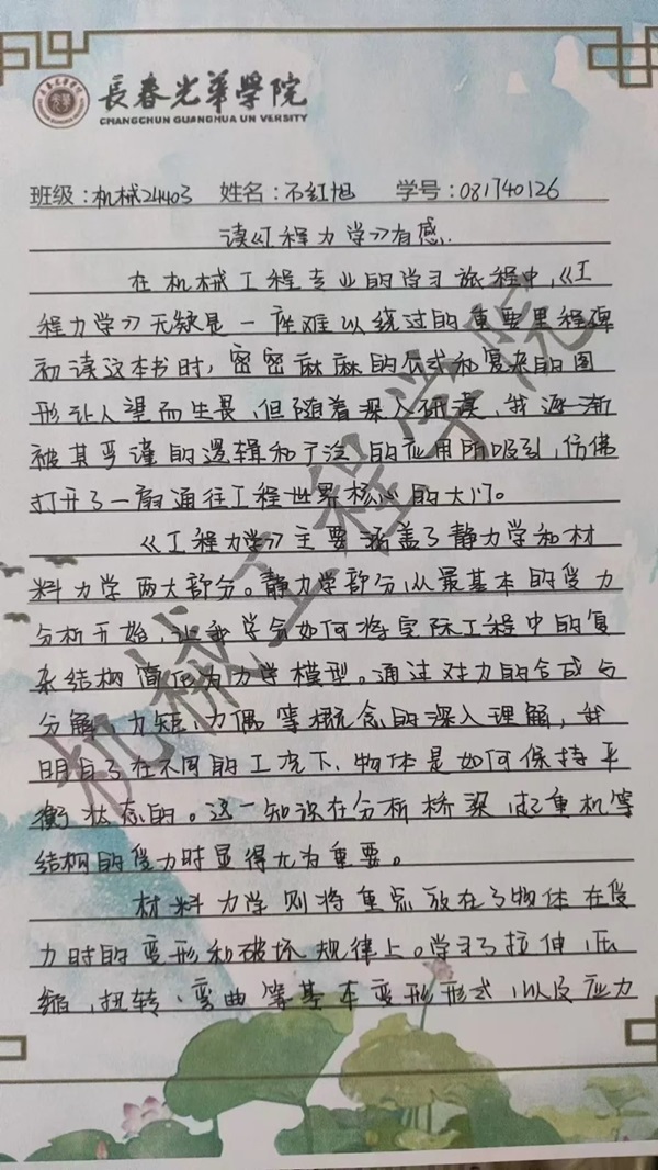 机设24403班的石红旭同学则选择了《工程力学》作为他的阅读材料。通过这本书,他深入了解了力学原理在工程设计中的应用,尤其是结构力学和材料力学部分的内容。书中不仅详细阐述了力的传递、变形和应力分析等基础知识,还结合了许多实际工程案例,使抽象的理论变得生动具体。工程力学不仅是机械设计的基础,更是解决复杂工程问题的关键。只有掌握了坚实的力学知识,才能在实际工作中应对各种挑战,成为一名优秀的工程师。