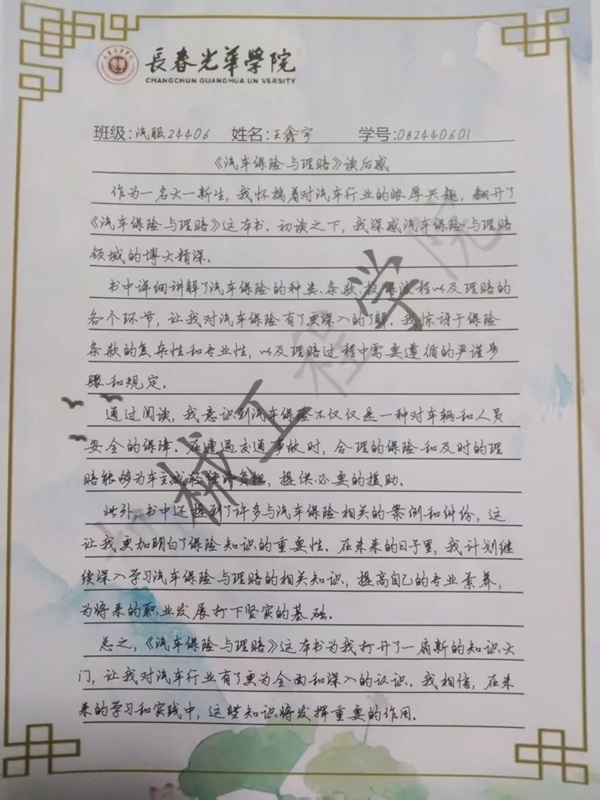 汽服24406班的王鑫宇同学在阅读完《汽车保险与理赔》后,深刻体会到了汽车保险在现代交通体系中的重要性。该书详细解析了汽车保险的基本概念、理赔流程以及相关法律法规,使她认识到保险不仅是保障车主权益的重要工具,更是维护社会稳定和谐的关键环节。书中通过大量实际案例的分析,帮助读者更好地理解保险条款和理赔程序,增强了她对这一领域的兴趣和信心。作为一名汽车服务工程专业的员工,掌握扎实的保险与理赔知识将为她未来的职业生涯打下坚实的基础。