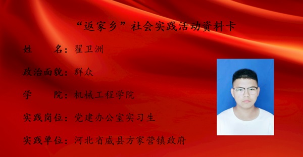 “知之愈明,则行之愈笃,行之愈笃,则知之益明。”在寒假的返家乡社会实践活动中,翟卫洲参与方家营镇政府党建办公室的实习,深入基层工作。他积极投身于党员信息的细致管理工作,以及各类党建活动的精心策划与组织。在实践活动中,需要各方的沟通协调,这不仅大大提升了他的沟通协作能力,还让他学会了如何与团队成员协同工作。这次工作经历让他收获颇丰,对党建工作有了全新的认识,同时他也对“为人民服务”这句话有了更深刻的理解。