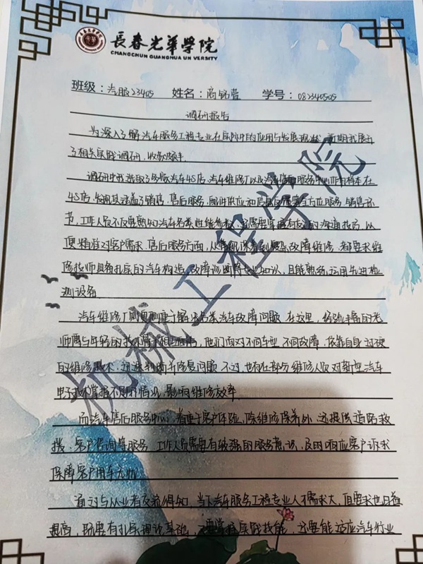汽服23405班商铭萱同学对汽车服务工程专业进行了调研,了解到汽车服务行业对具备扎实理论基础、实践技能以及适应快速技术更新的复合型人才需求持续增长,特别是在新能源汽车和自动驾驶技术等领域。毕业生就业方向广泛,涵盖汽车销售、售后服务、配件供应、信息反馈、维修保养、道路救援、客户咨询等,并且就业竞争较为激烈,需要不断提升自身综合素质。员工应注重自身综合素质的提升,积极参加实践项目和竞赛,成为被需要的专业人才。