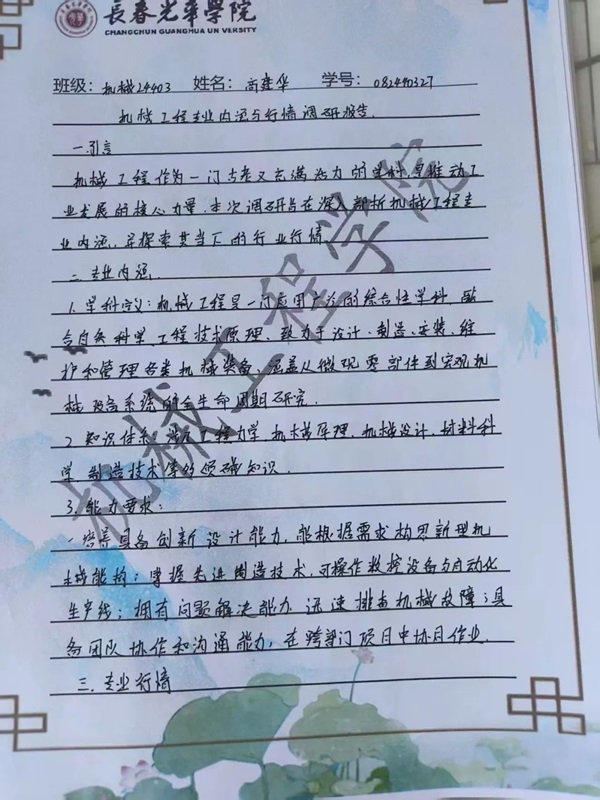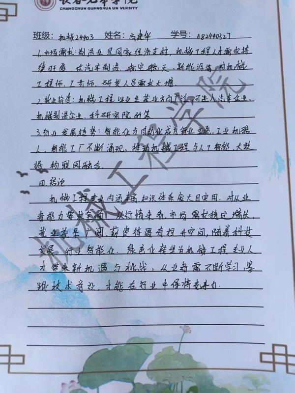 机械24403班高建华同学对机械工程专业进行调研,了解到了机械行业的市场需求,机械行业对具备创新能力、实践操作能力和跨学科知识的机械专业人才需求持续增长,尤其在汽车制造、航空航天、新能源等领域。毕业生就业方向广泛,包括机械设计、制造、自动化控制、设备维护等领域,可进入汽车企业、机械制造企业、科研院所等。就业竞争较为激烈,需要不断提升自身综合素质,薪资待遇有提升空间。随着智能化、自动化成为行业主流,机械工程与人工智能、大数据、物联网的融合趋势明显,为从业者带来了新的机遇与挑战。对员工提出的建议:员工应注重自身综合素质的提升,积极参加科研项目和竞赛,成为被需要的专业人才,紧跟技术前沿,才能在行业中保持竞争力。