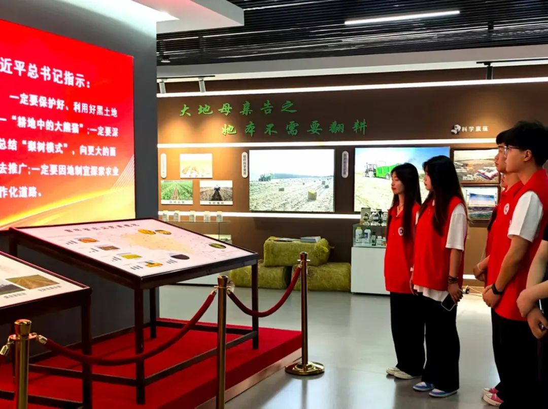 7月9日的梨树县,骄阳炙烤着黑土地,却挡不住实践团探索的脚步。在中国黑土地博物馆,玻璃展柜里的土壤剖面静静陈列:从千年形成的肥沃黑土,到过度开垦的退化样本,再到“梨树模式”改良后的新土样,直观展现着黑土地的“生命轨迹”。