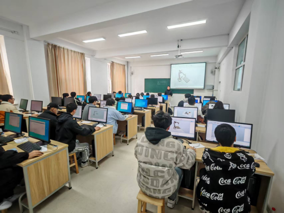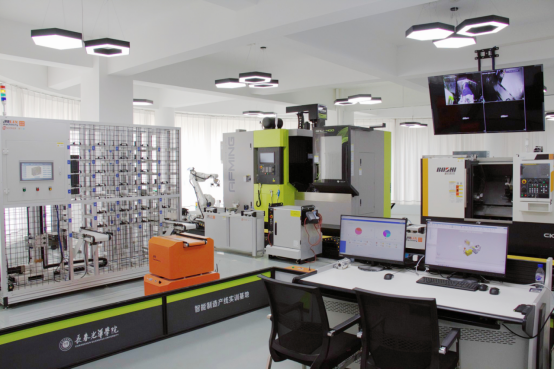 智能制造技术实验室于2023年初建立并投入使用,占地面积约200平方米,设备总价值340余万元,主要由一条智能产线和41台电脑的机房组成。